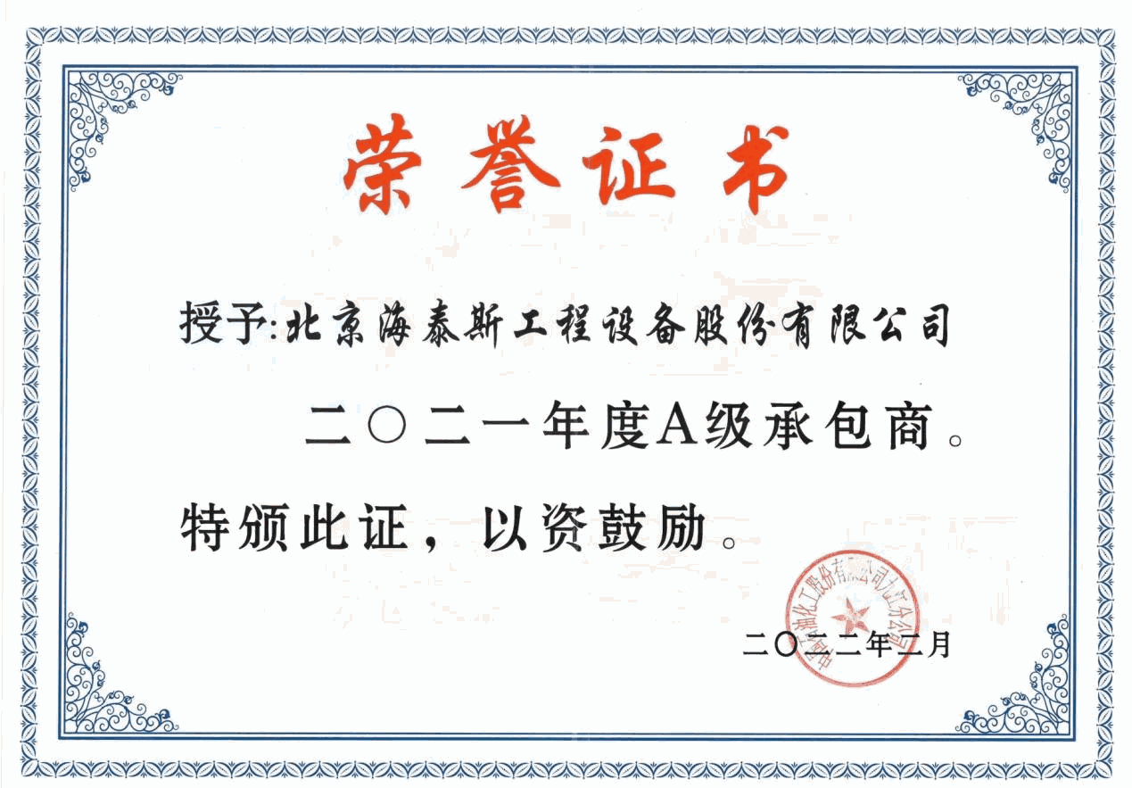海泰斯為優(yōu)質(zhì)客戶提供的法蘭連接密封完整性管理方案及工程技術(shù)服務(wù), 被授予“二0二一年度A級承包商”榮譽稱號。
